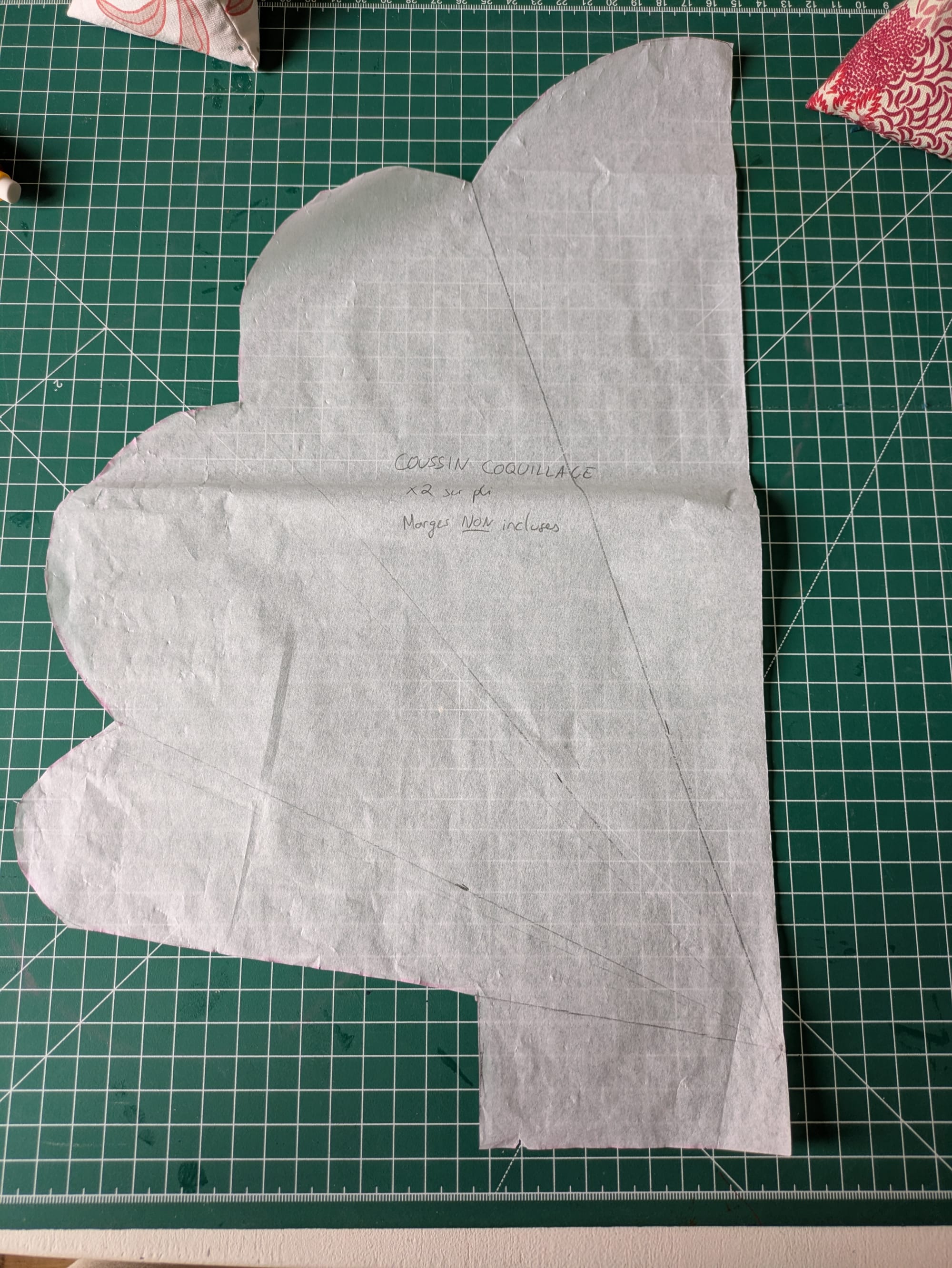 Je n'ai pas trouvé de patron gratuit qui me convenant donc j'ai créé le mien en m'inspirant de ce post qui fait la même forme mais pour un tapis d'éveil. J'ai calculé le ratio largeur hauteur et dessiné mon propre patron. Pour avoir un bon ratio entre les rainures du coquillage, j'ai aussi mesuré chaque angle et reporté ça sur mon patron pour savoir où coudre les rainures.