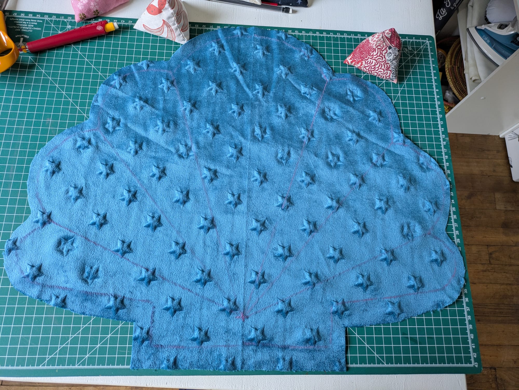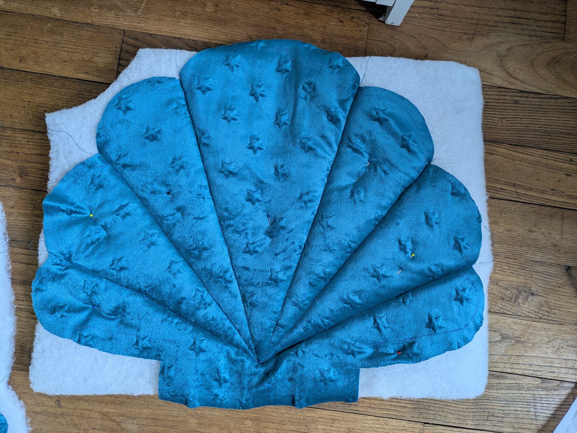 J'ai eu l'inspiration de faire un coussin qui servirait de coussin au sol, par exemple pour s'asseoir par terre avec les enfants, et j'ai très vite su que je voulais le faire dans le tissus bleu étoile peluche et en forme de coquille Saint-Jacques.