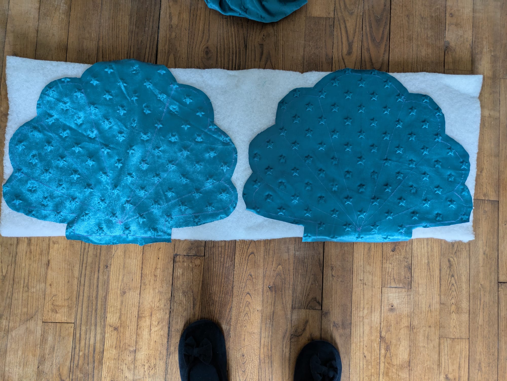 On coupe d'abord les deux pièces coquillage dans le tissus, puis on marque sur le dessus du tissus les marques pour guider la couture du molletonnage. J'ai aussi marqué les couture de coutés qui m'ont été utile par la suite. On place le tissus sur le molleton (la chance, j'avais tout pile la bonne quantité), et on couds précautionneusement les lignes. Normalement, on devrait voir très vite l'effet voulu. Là j'avais un molleton particulièrement epais (2 à 3cm) donc les lignes ressortent très bien.