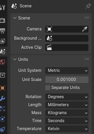 Pour la modélisation 3D ayant pour objectif l'impression 3D, je modifie les réglages afin d'avoir un système d'unités en millimètres, et je change les paramètres de vue pour avoir une grille et une viewport camera convenables.