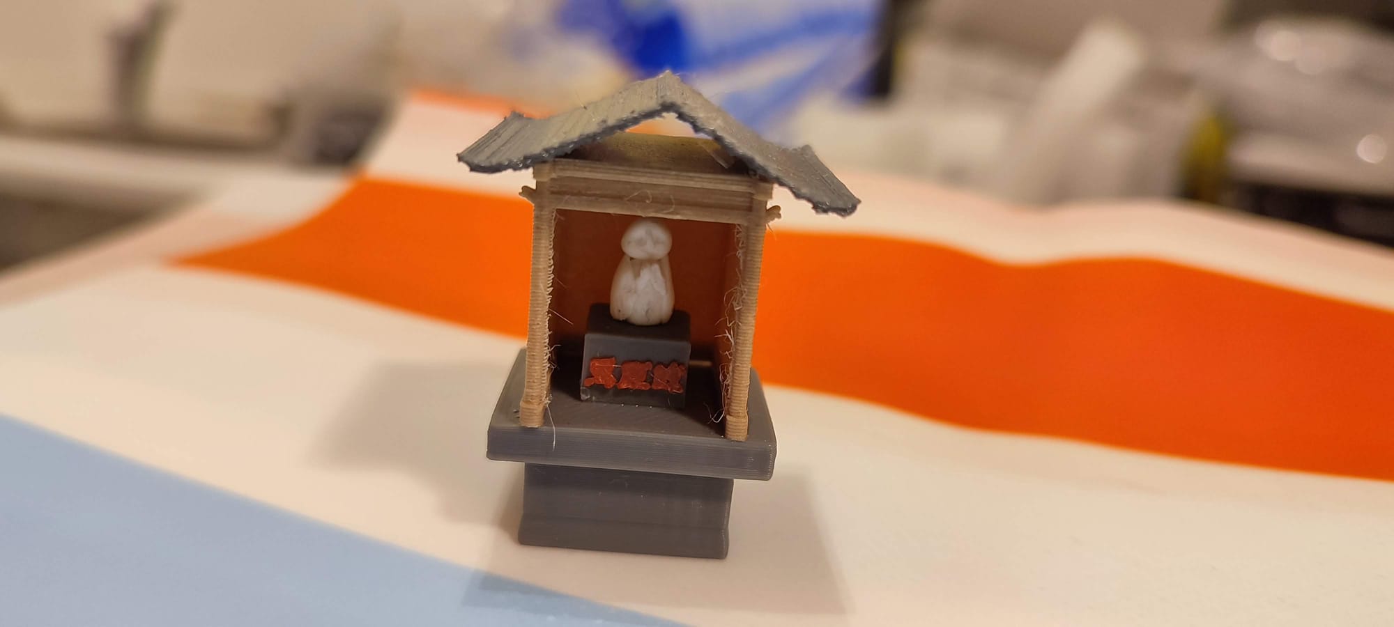Si l'impression ne réussit pas, il est nécessaire de modifier le modèle 3D ou les paramètres d'impression pour obtenir un imprimé de meilleure qualité. Par exemple, le toit de la torii était de mauvaise qualité imprimée dans son sens final, mais l'imprimer sur le côté a permis d'améliorer la précision de la buse et donc d'obtenir une bonne impression.