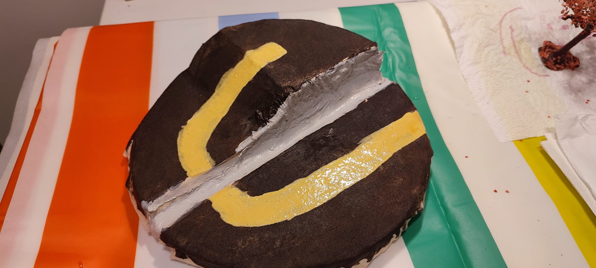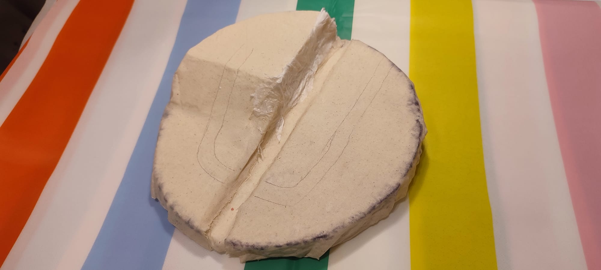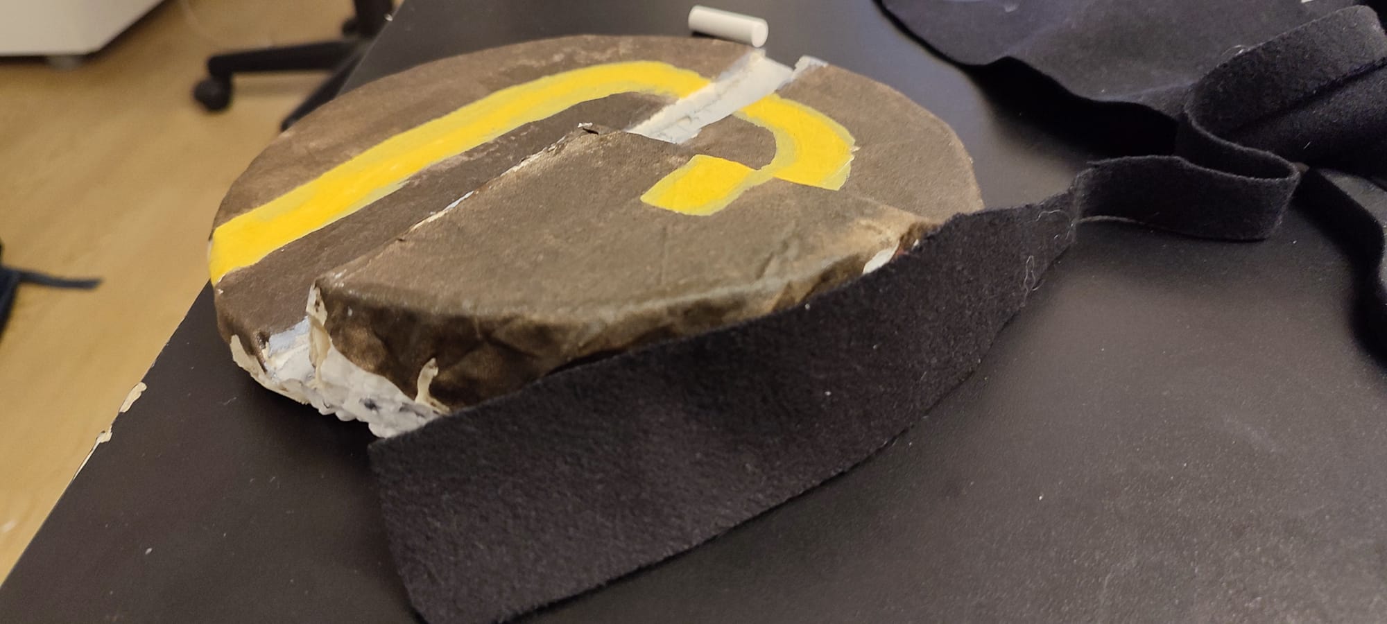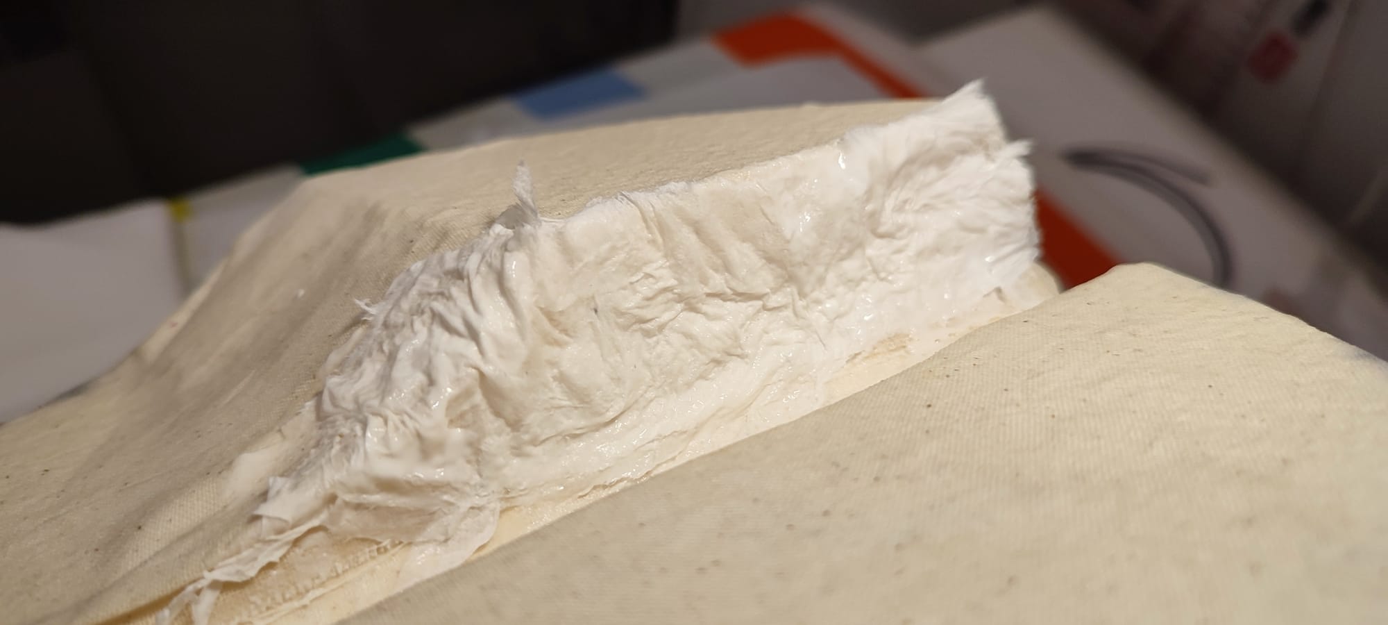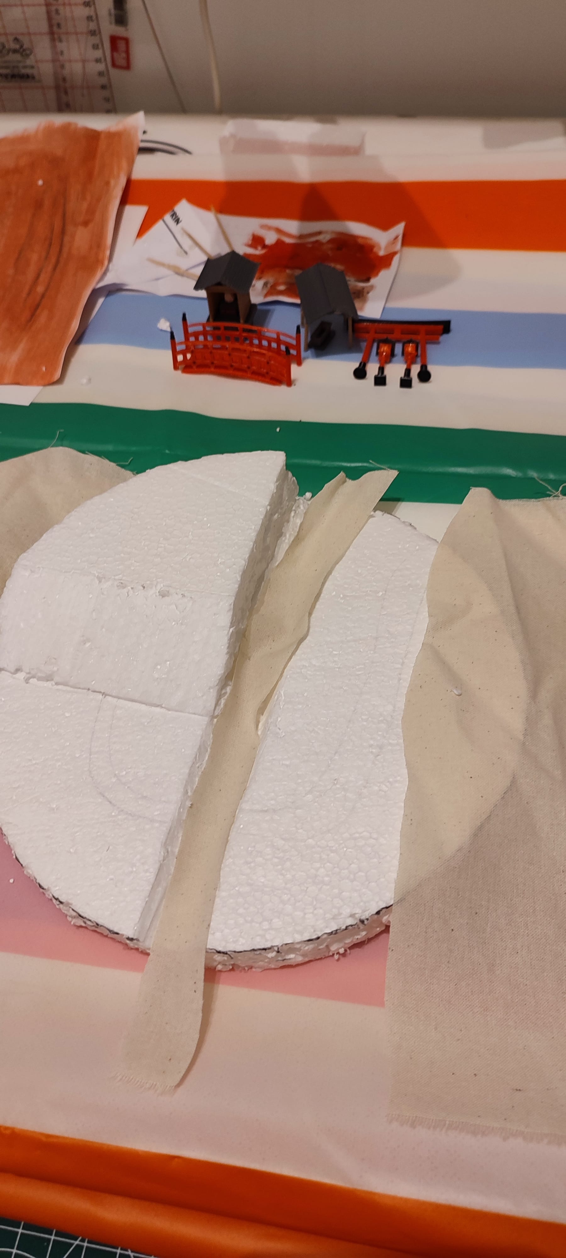 Pour que la base conserve sa forme, et pour lisser le dessus, j'ai utilisé la technique de Nerdforge, qui consiste à tremper du tissu dans un mélange colle blanche et eau pour recouvrir le polystyrène.