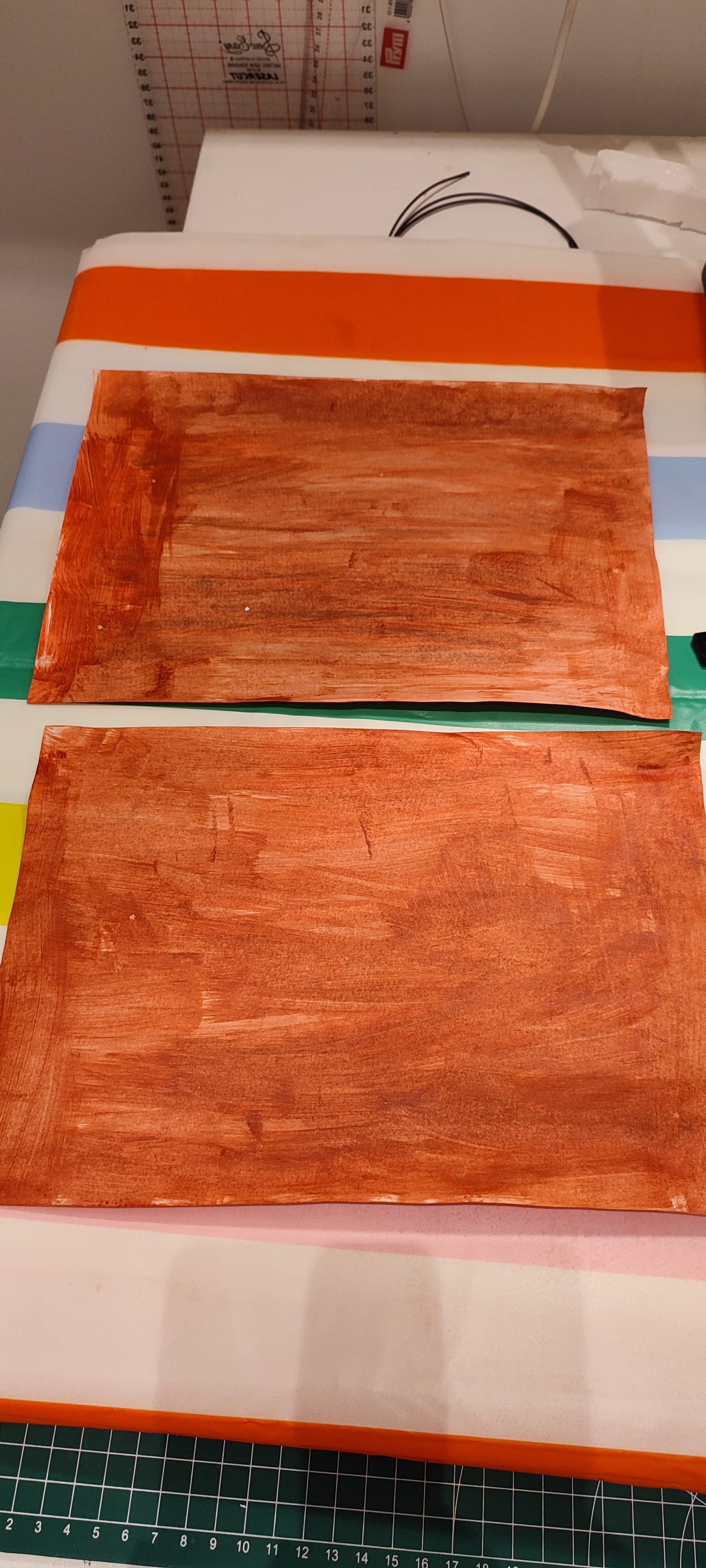 Une fois la colle sèche, j'ai peint à l'acrylique le tissu avec les couleurs approximatives de la terre et du sable qui recouvriront le tissu.