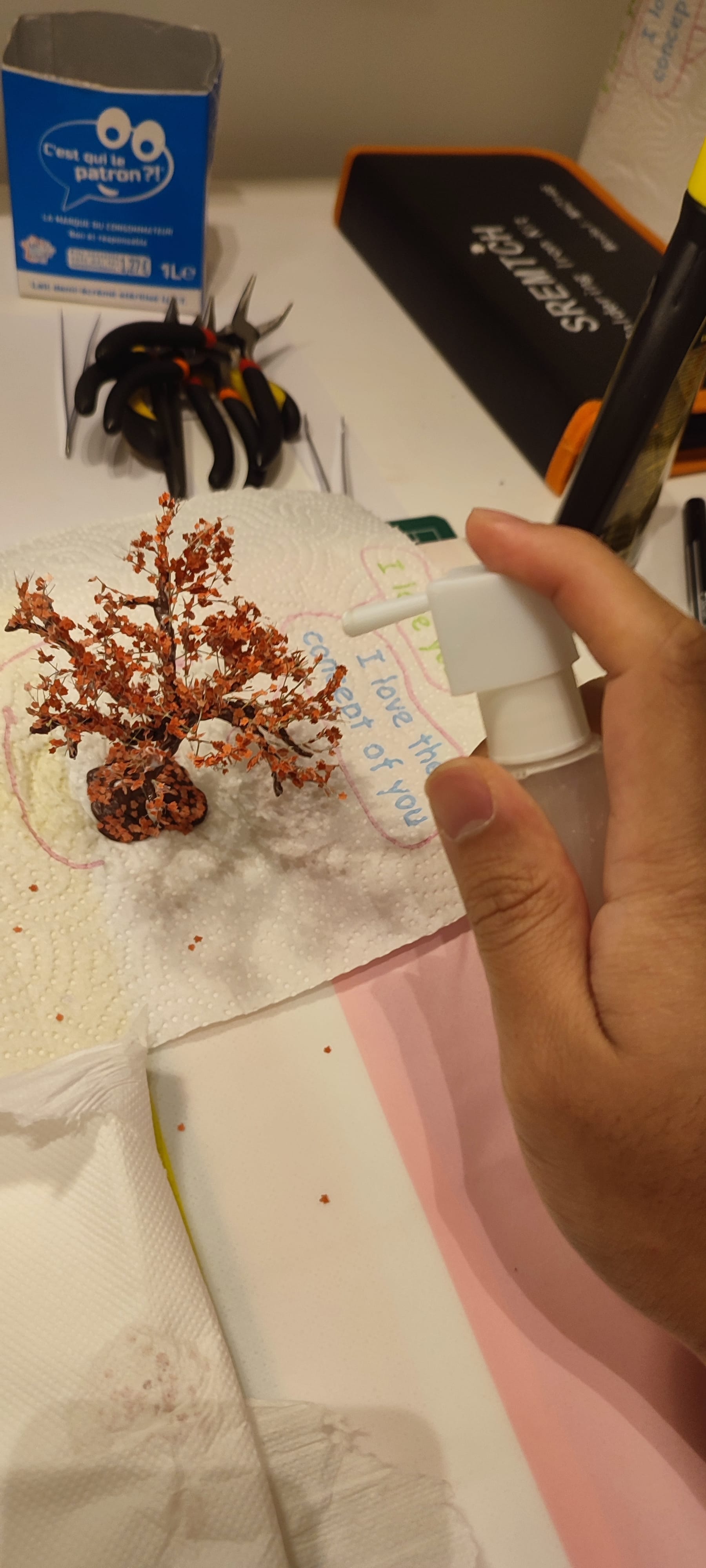 Enfin, le plus dur a été d'accrocher les feuilles à la structure, à l'aide du mélange colle blanche et eau pulvérisé sur les branches.