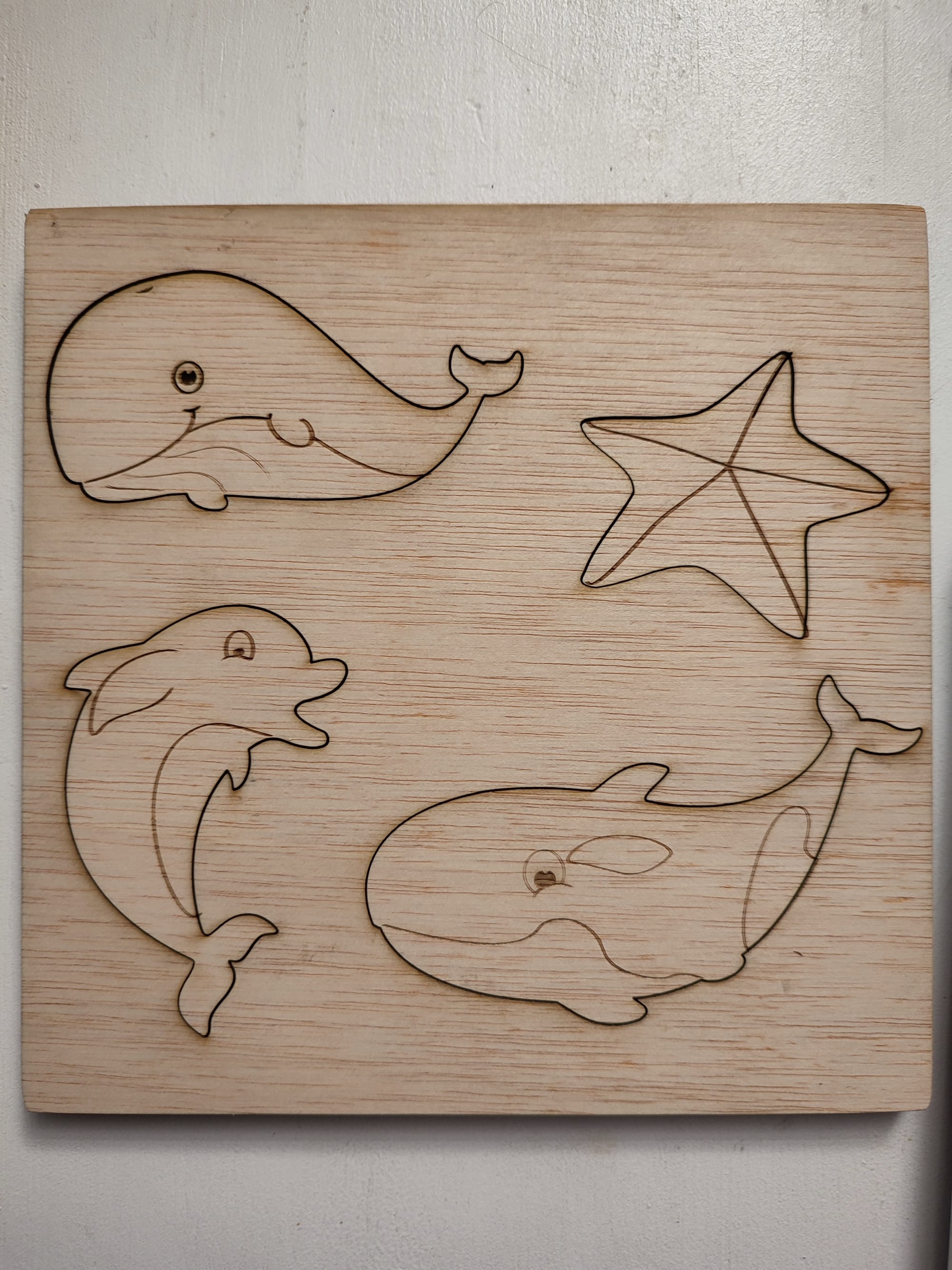 Les deux planches sont découpées en carré avec une découpeuse laser, et dans celle du dessus j'ai également découpé les formes des animaux avec quelques lignes gravées.