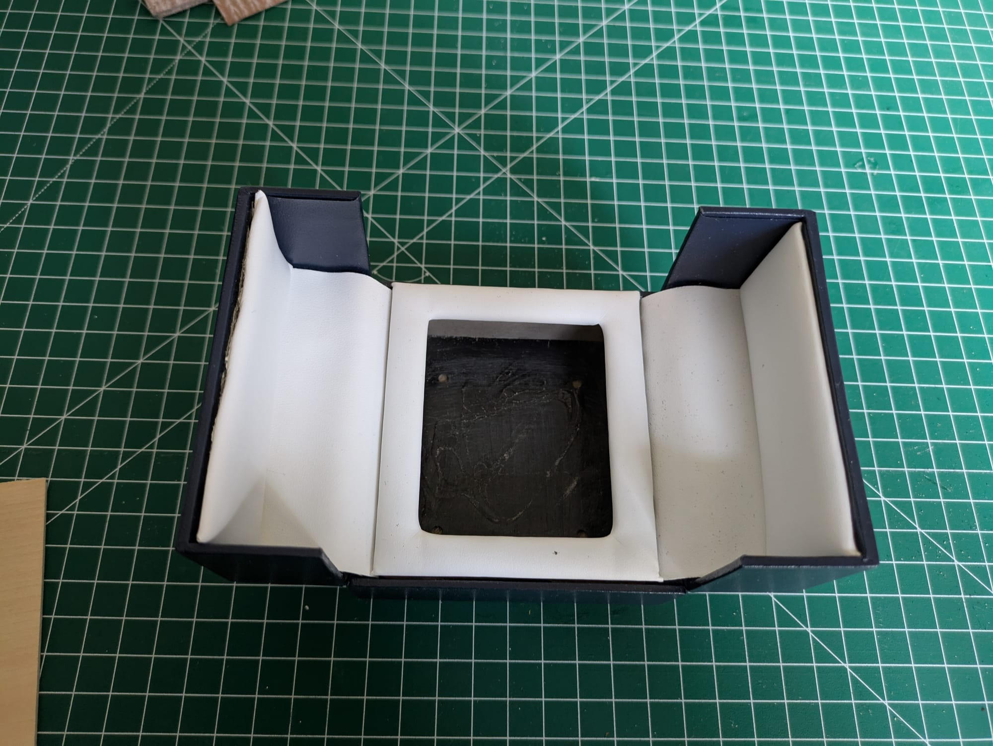 Une boite de 9cm sur 7cm avec 3cm de profondeur et une ouverture centrale. Il manque déjà le coussin à bague qui a été réutilisé dans la boîte de nos fiançailles.