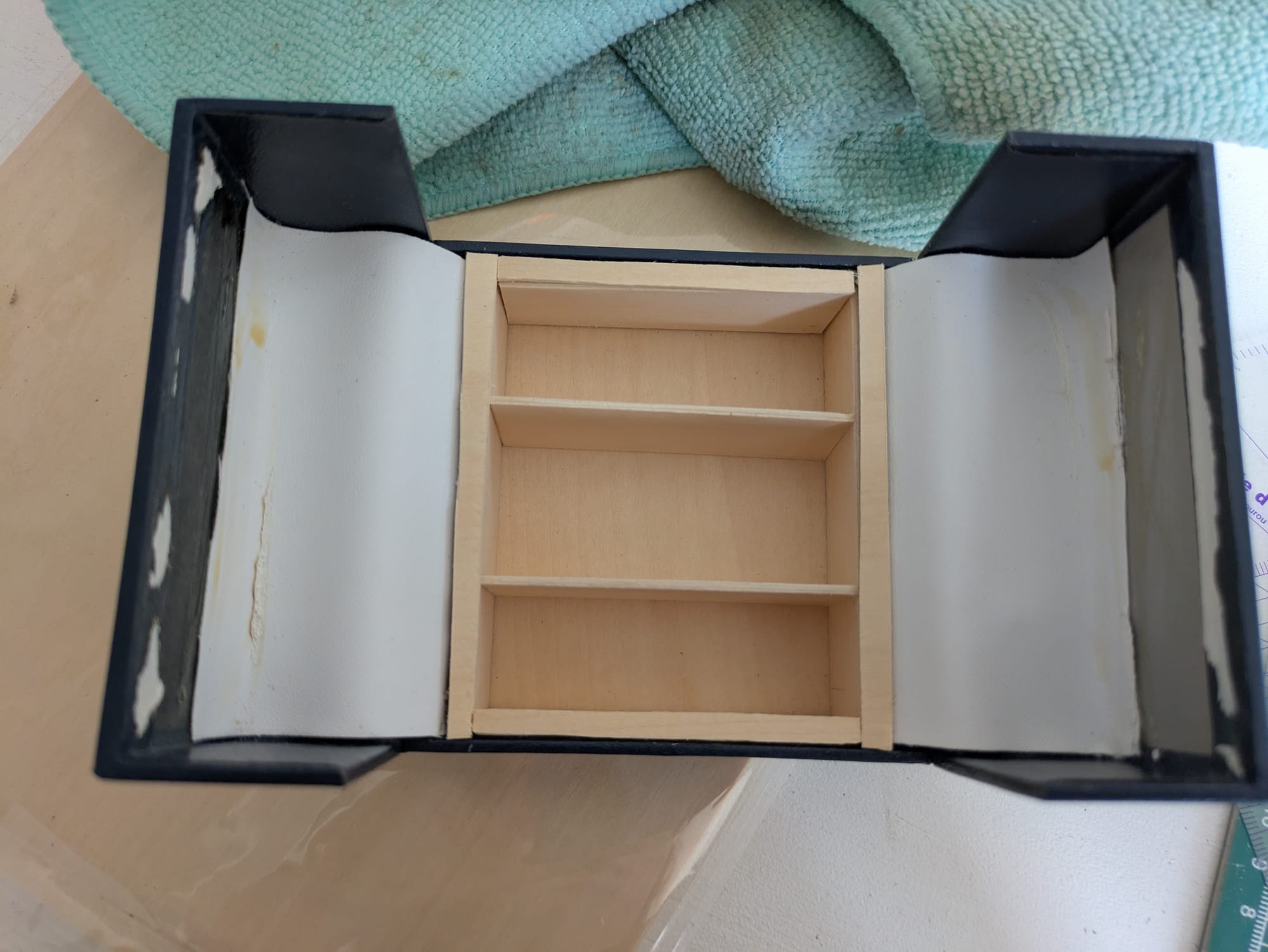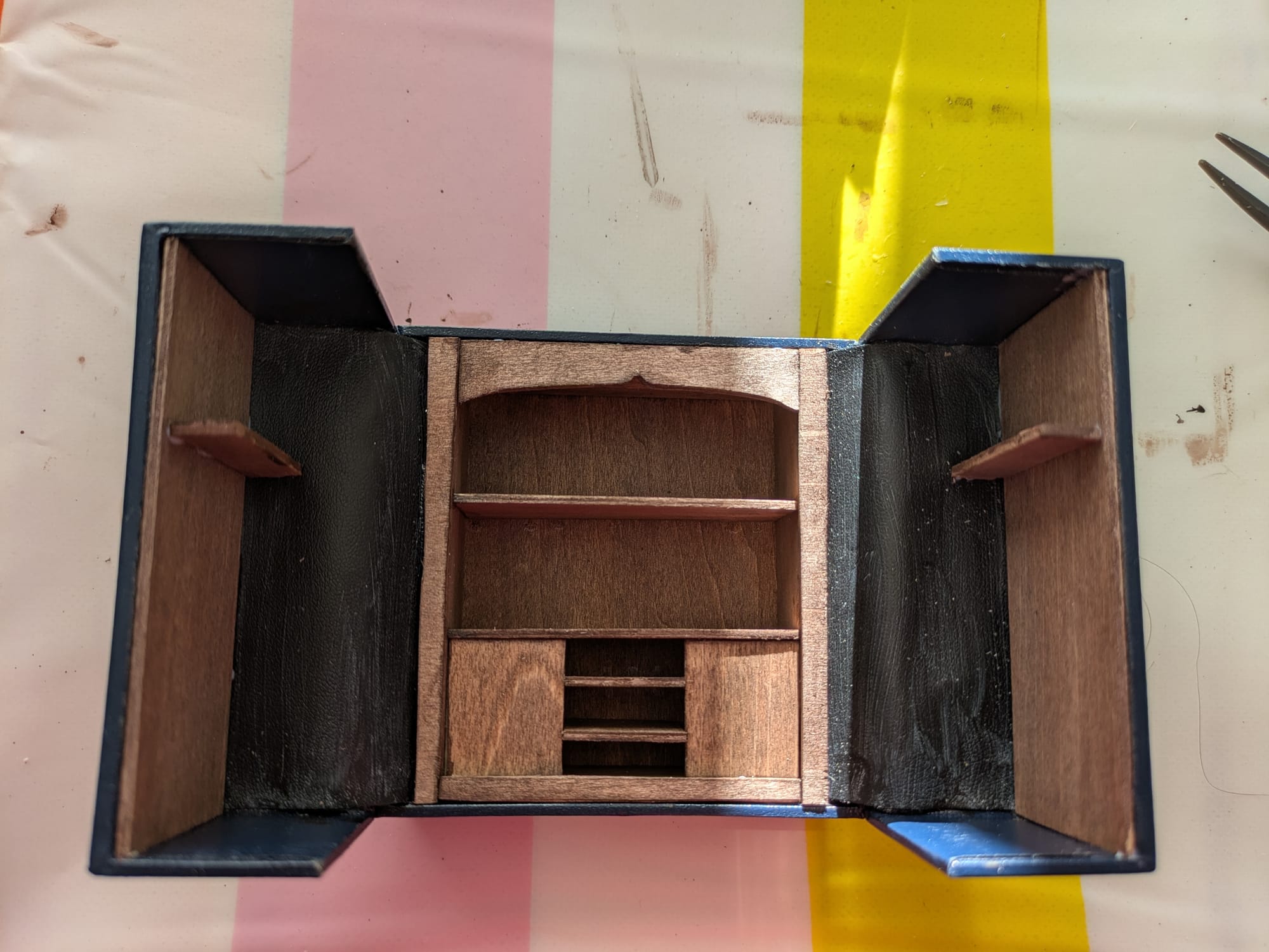 La boîte dans laquelle venait ma bague de fiançailles a une ouverture originale et dès que Alexandre me l'a montré j'ai demandé à la garder pour un jour faire une miniature dedans. Trois ans plus tard, je me lance le défi de compléter cette miniature en un mois.