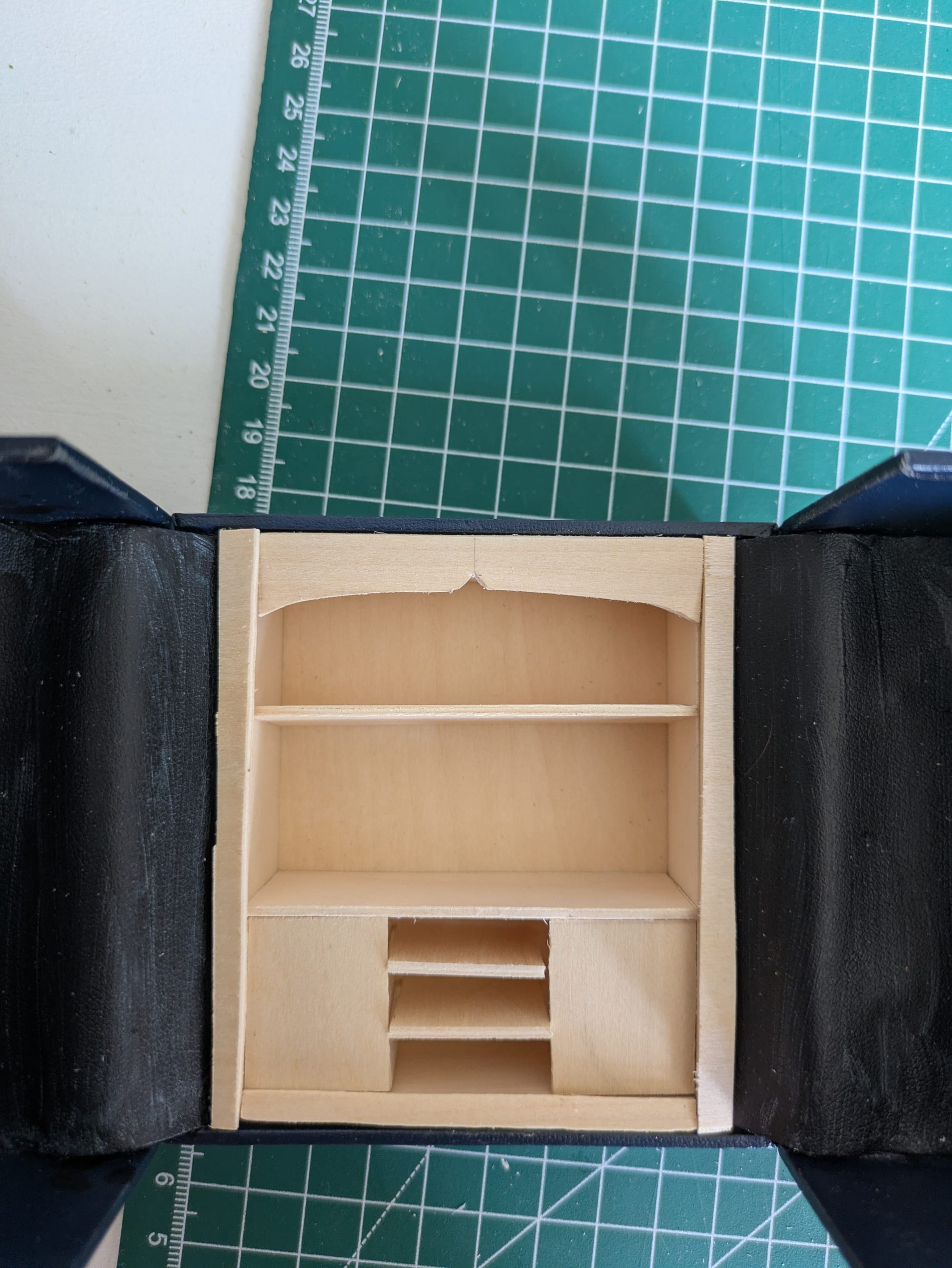 Pour l'armoire et les murs j'utilise des feuilles de bois de 2mm d'épaisseur. Elles se coupent au cutter en quelques passages. J'ai pris des mesures initiales puis ajusté pour que tout rentre. Pour une jolie finition, il y a des fines bandes sur les côtés et le haut a une forme décorative. Sur le bas, j'ai créé deux portes et des étagères plus petites.