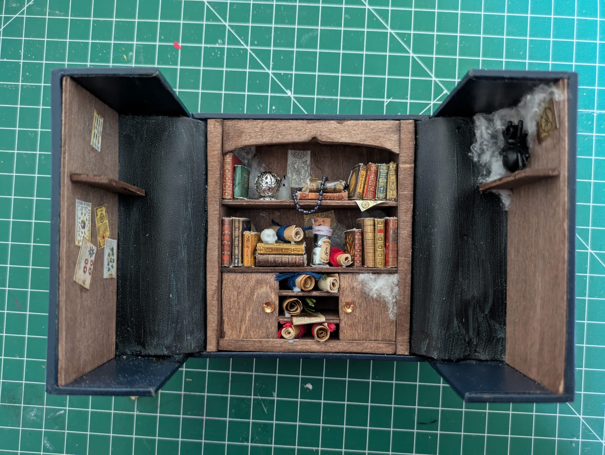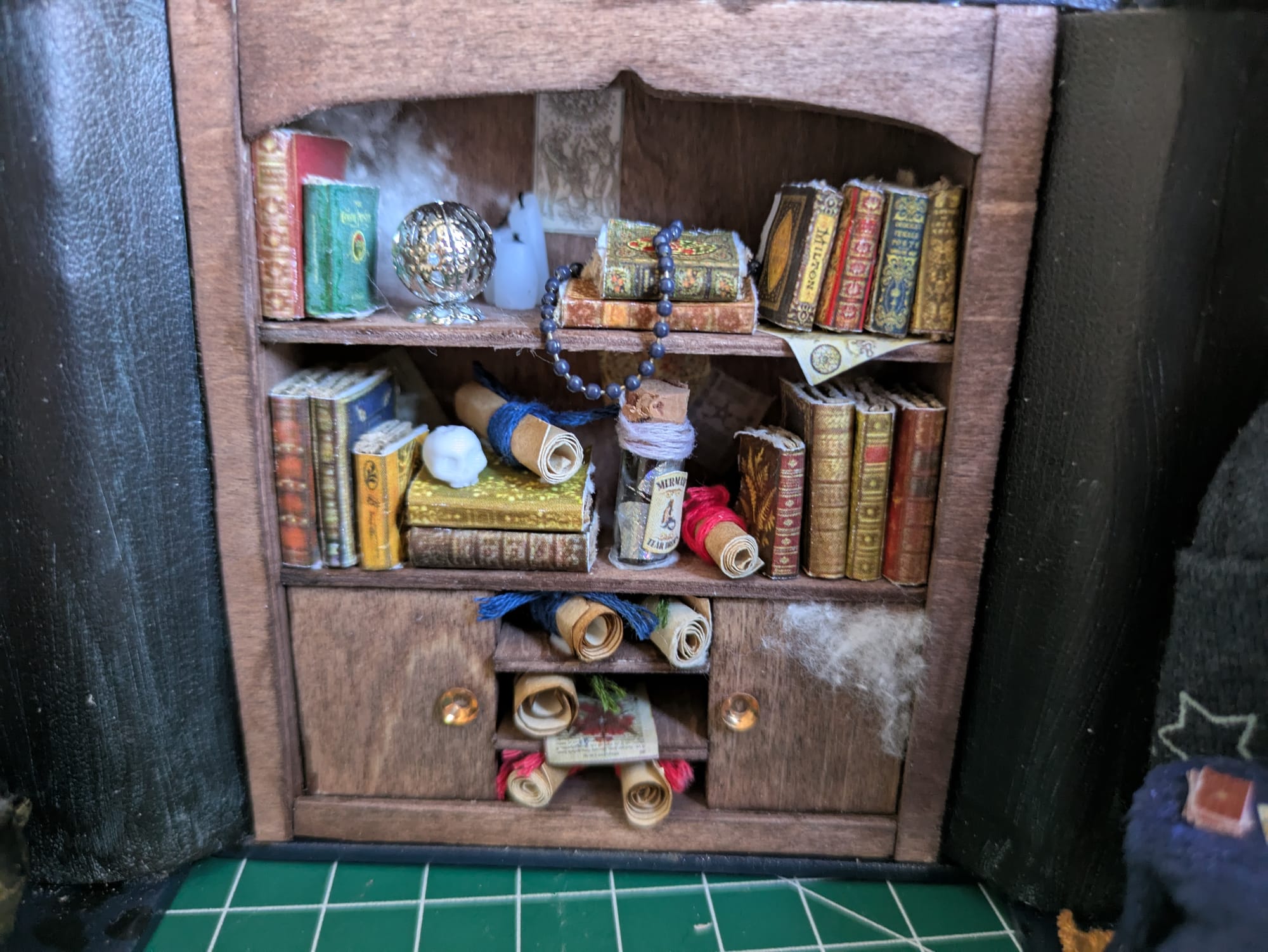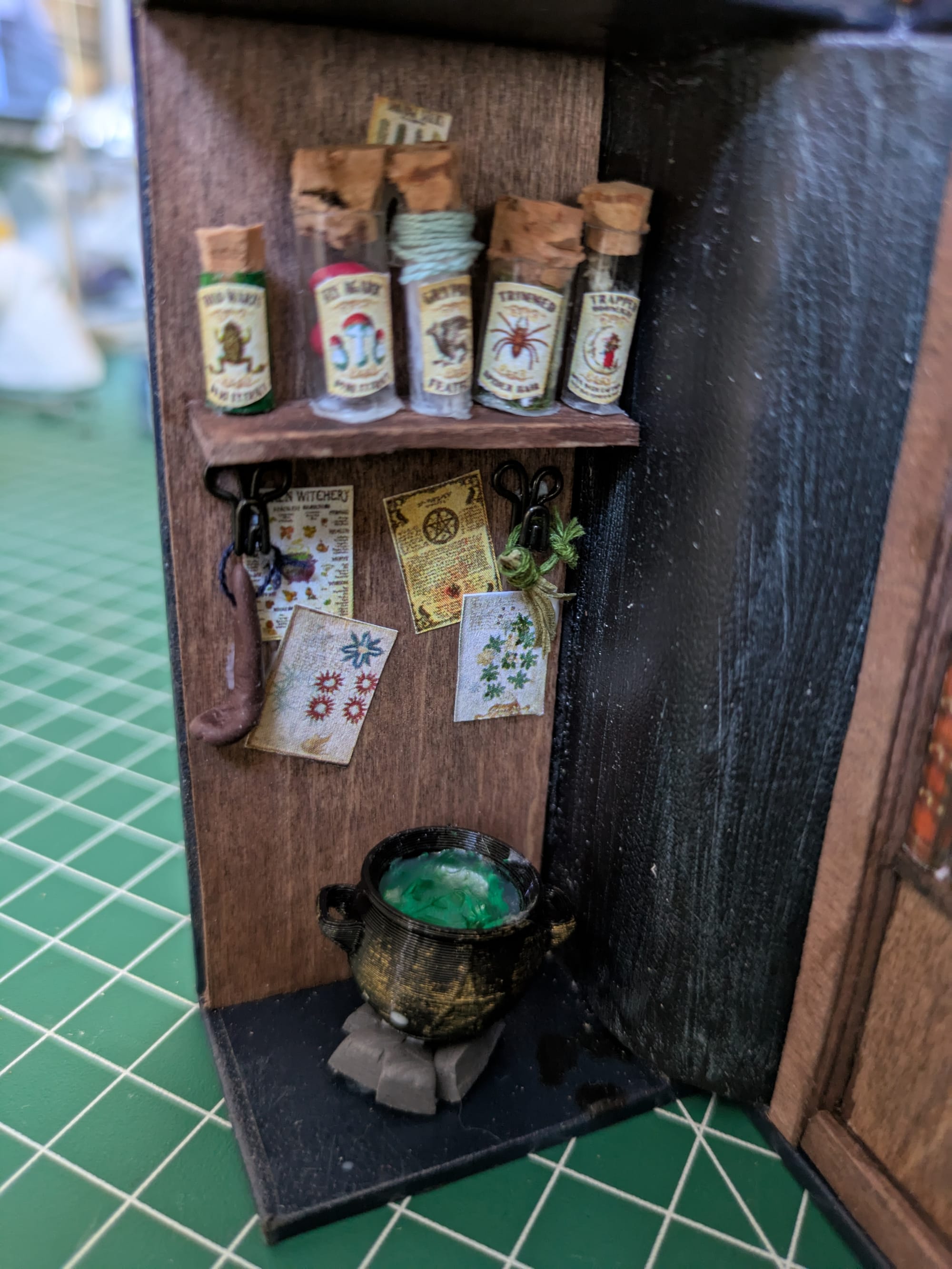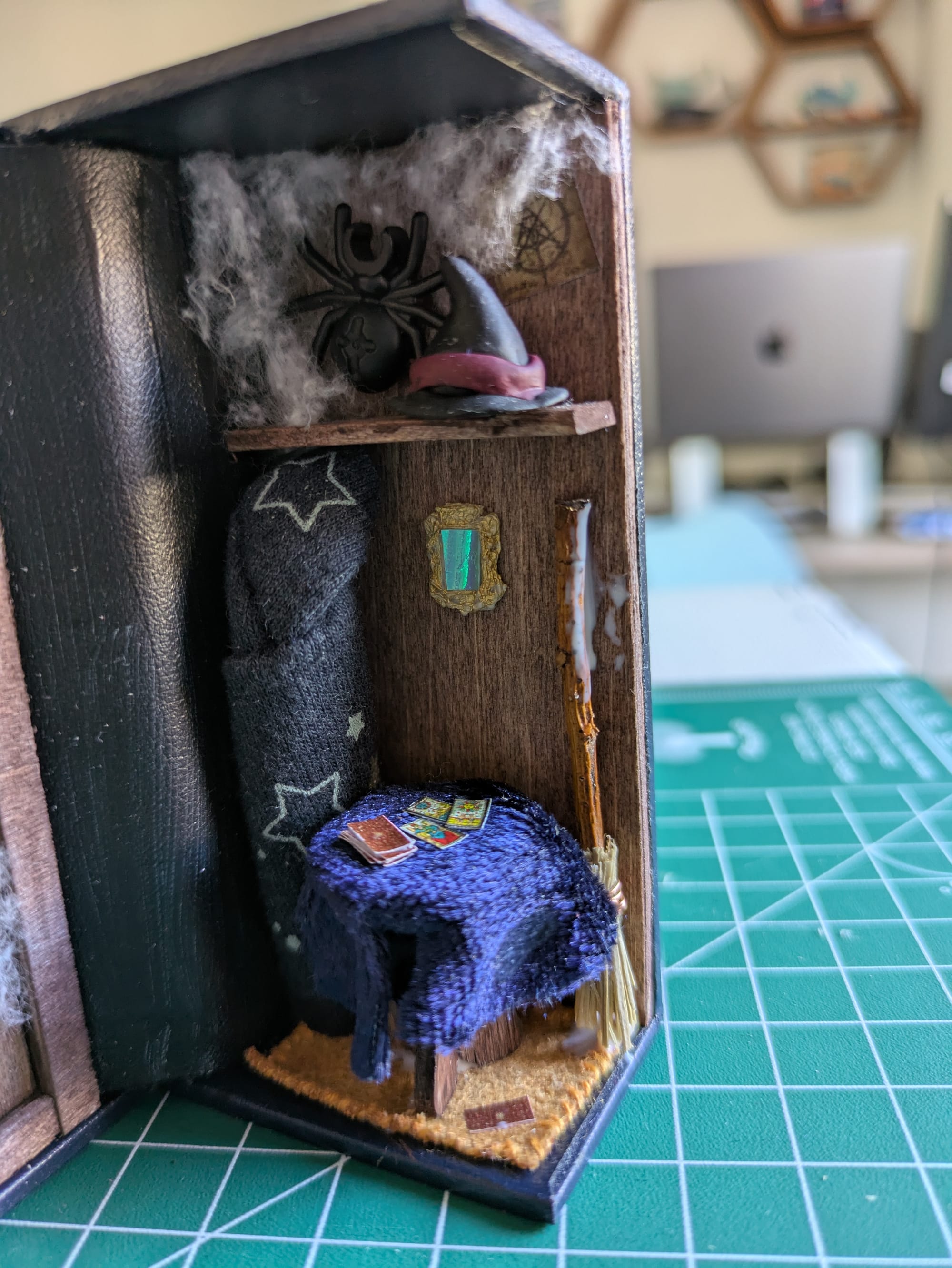 Le manteau et le tapis sont cousus main. Le chapeau, les bougies et la cuillère sont fait en Fimo. Le crâne et le miroir sont imprimé en 3D, puis j'ai rajouté un papier iridescent sur le miroir. Les affiches sont imprimées.
