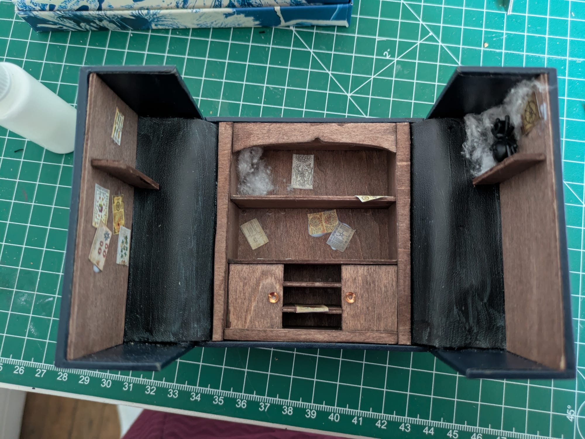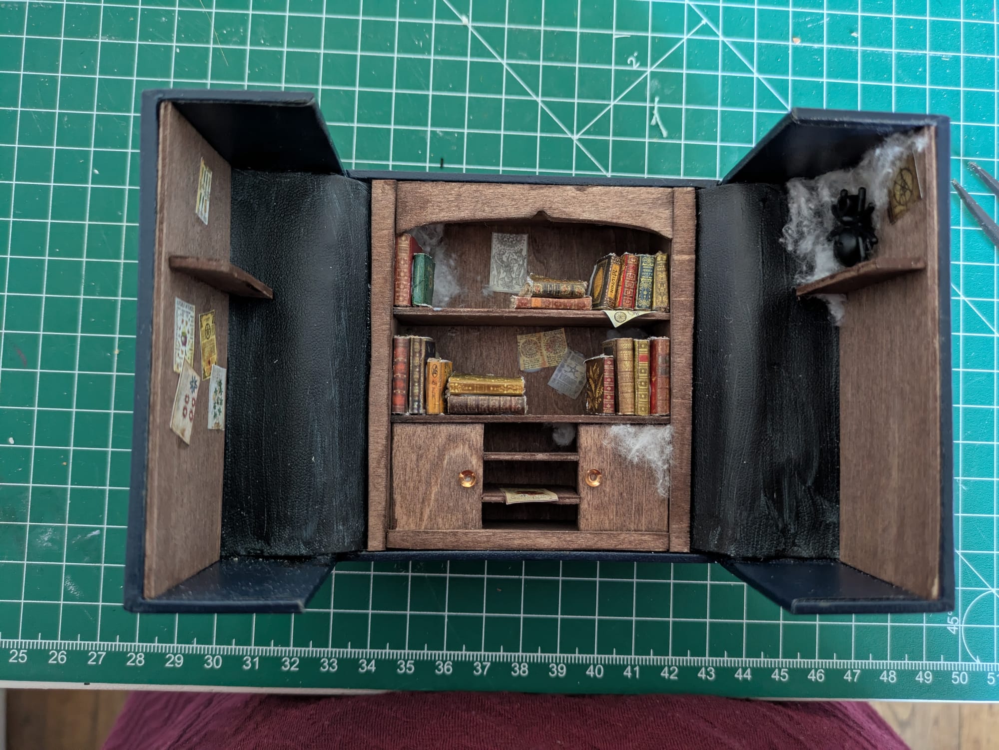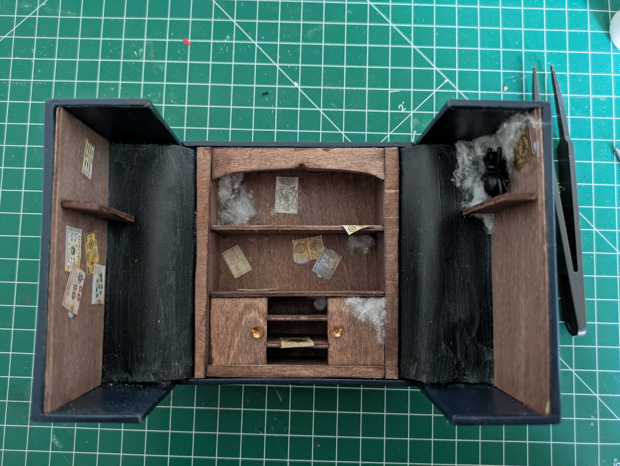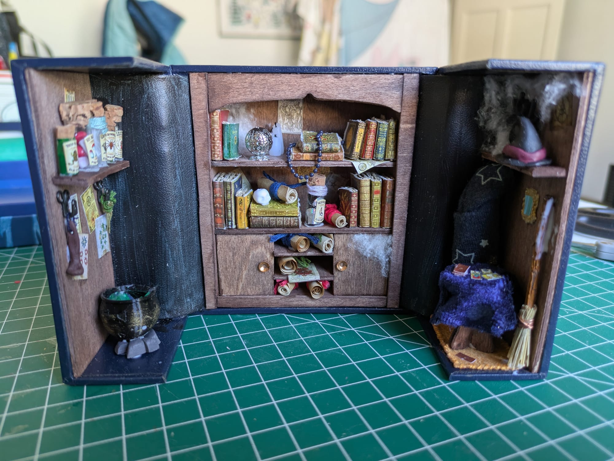 Le manteau et le tapis sont cousus main. Le chapeau, les bougies et la cuillère sont fait en Fimo. Le crâne et le miroir sont imprimé en 3D, puis j'ai rajouté un papier iridescent sur le miroir. Les affiches sont imprimées.